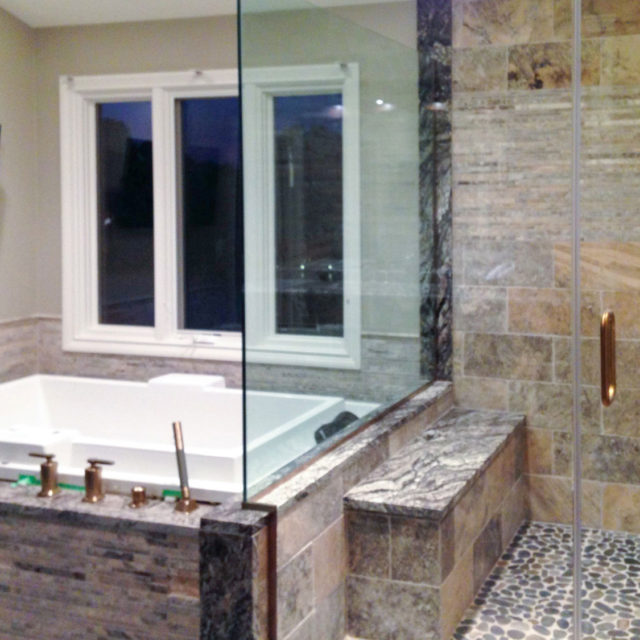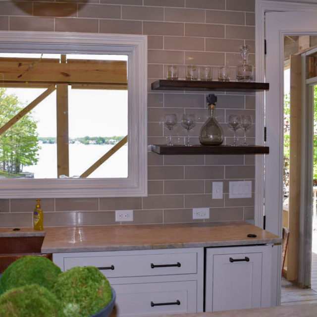 The newly configured space was created to enhance beautiful view of the lake.This was achieved by closing a wall to allow a large window on adjacent wall to look out to lake. The window was framed with large beveled hand glazed tile and layered with walnut floating shelves.