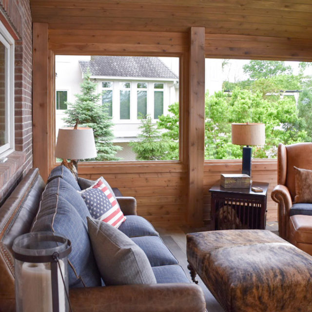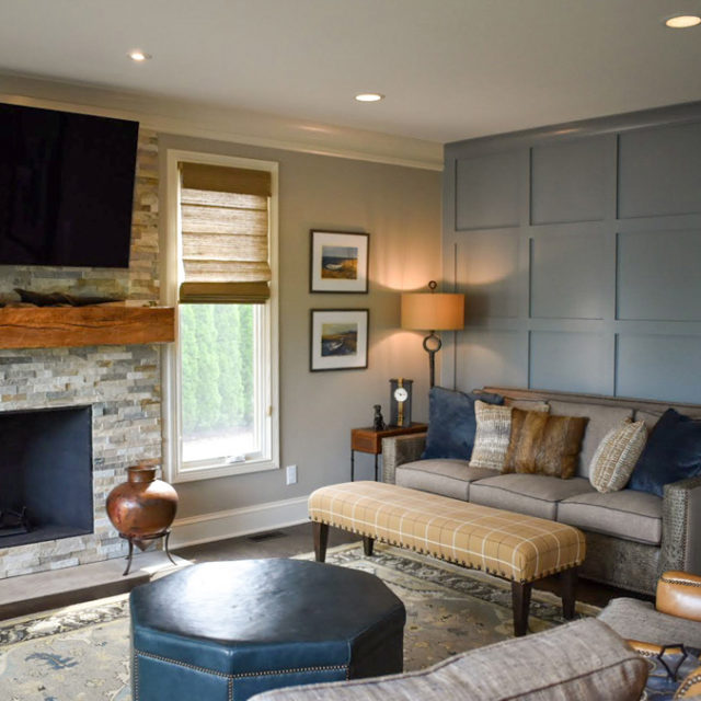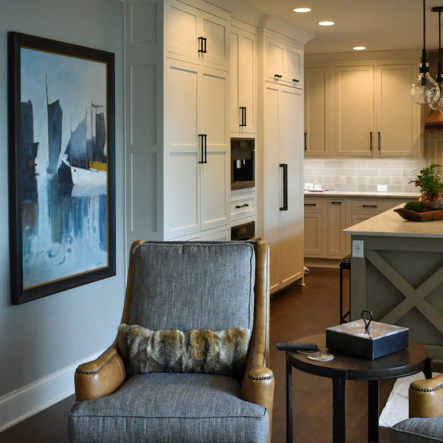 The hearth room was given new function by eliminating breakfast nook and creating an inviting seating area looking out to the lake. All is in the details with a mix use of hair on hide, leather, tweeds, naitrim and plaids. Creating warmth by re-facing fireplace with a natural stone in tones from the kitchen area and using a reclaimed barn beam for the mantle for a rustic touch. Adding a pop of color with an accent wall in blue tones to bring the outside in. Abstract art ties the 2 rooms together