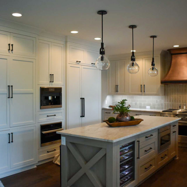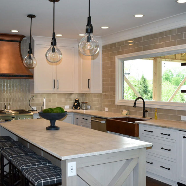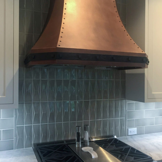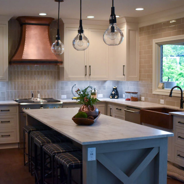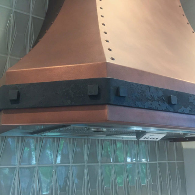 Kitchen is a mix of modern and rustic touches with elements of copper, forged metal, Wood elements and stone. The copper hood makes a statement, custom designed with forged steel detail and rivets. Copper was continued throughout with a large farmhouse sink and striations of copper and warm grays in the Quartzite countertops.